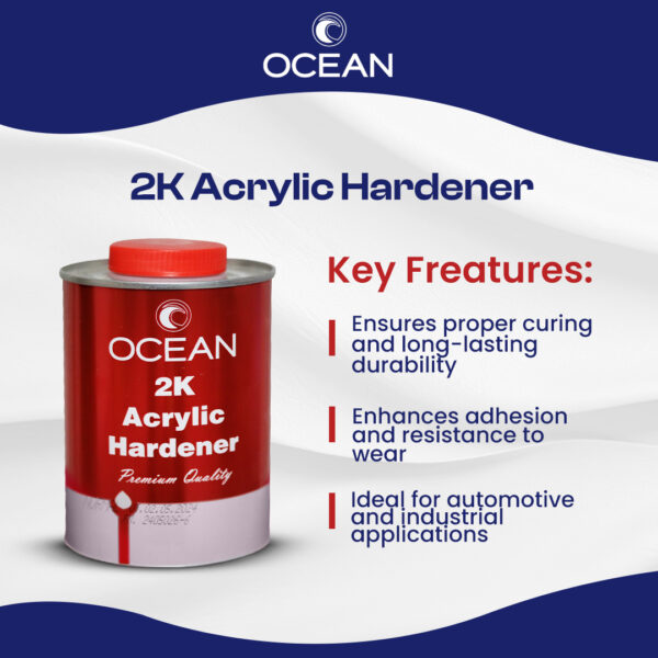 Achieve a durable, professional finish with OCEAN 0.500L 2K Acrylic Hardener. Specially formulated for OCEAN 2K Acrylic Primers and Topcoats, this high-quality hardener ensures proper curing, enhanced adhesion, and long-lasting protection. Ideal for automotive and industrial applications, it provides a smooth, even finish with excellent resistance to wear, chemicals, and weathering.